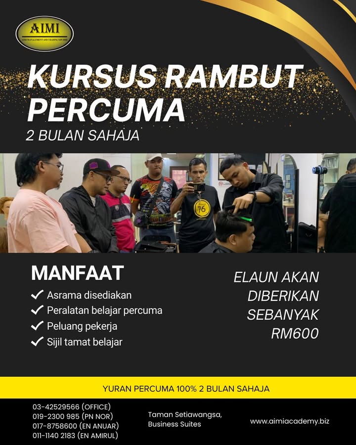 ❌ Tiada bayaran dikenakan ❌ Tidak memerlukan pengalaman ✅ Pembelajaran dandanan rambut secara praktikal ✨ KURSUS RAMBUT PERCUMA (1 BULAN) ✨ Program ini memberi peluang kepada individu yang berminat...