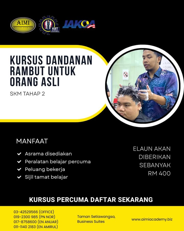 ❌ Tiada yuran penyertaan ❌ Tidak memerlukan pengalaman ✅ Latihan dandanan rambut secara praktikal ✨ KURSUS RAMBUT PERCUMA ✨ ⏰ Tempoh Kursus: 1 Bulan Program ini ditawarkan kepada individu yang berm...