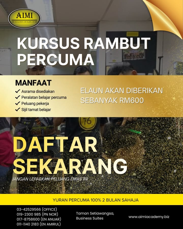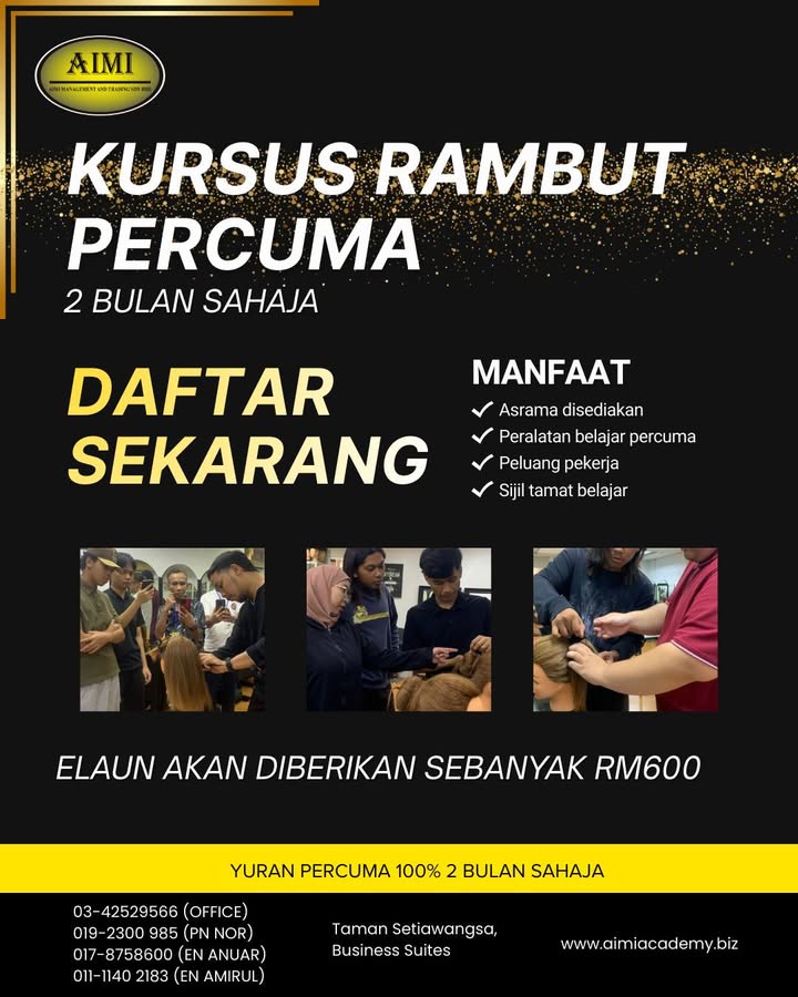 ❌ 0 YURAN ❌ 0 PENGALAMAN DIPERLUKAN ✅ 100% LATIHAN PRAKTIKAL ✨ KURSUS RAMBUT PERCUMA – 1 BULAN ✨ Belajar kemahiran asas dan teknik moden dandanan rambut sebagai persediaan untuk peluang pekerjaan a...