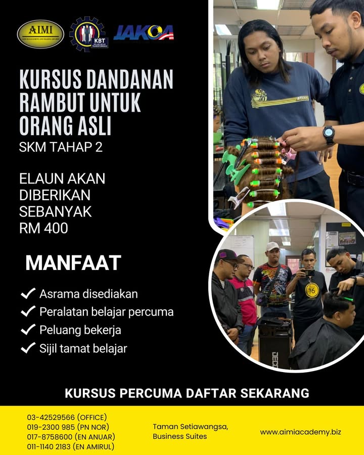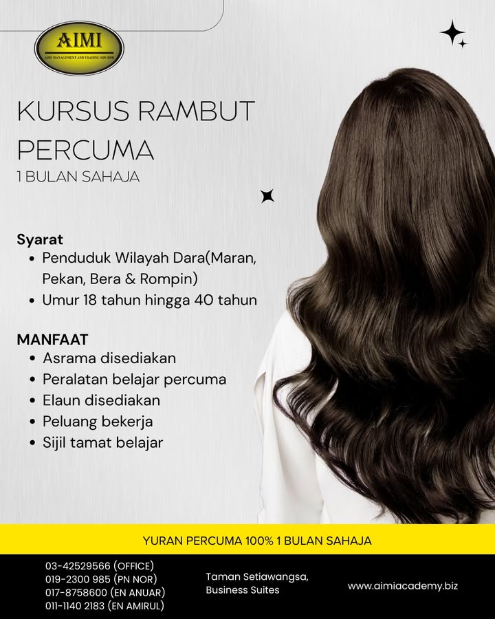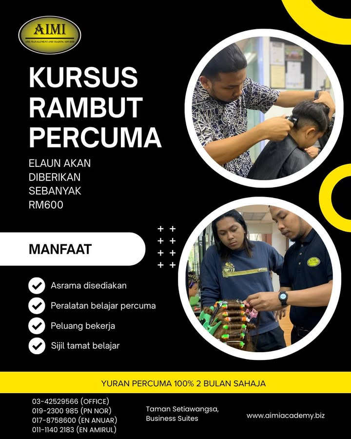 ❌ Bayaran PERCUMA ❌ Tiada pengalaman diperlukan ✅ Terus belajar kemahiran dandanan rambut secara praktikal ✨ KURSUS RAMBUT 1 BULAN ✨ Berminat untuk jadi mahir dalam dandanan rambut? Kursus ini sesu...