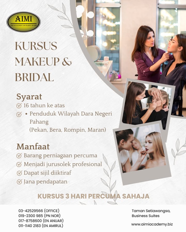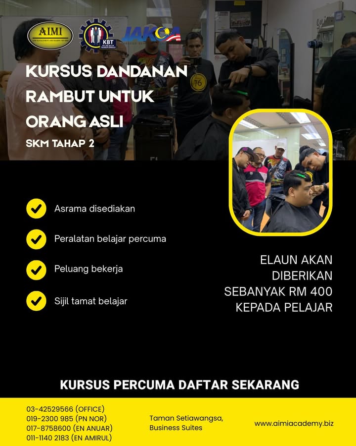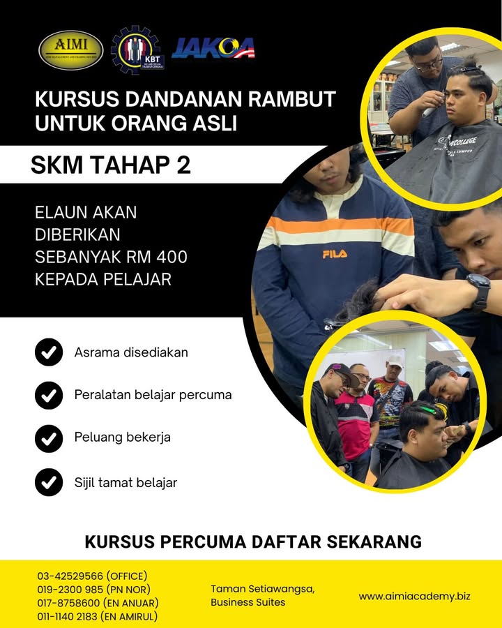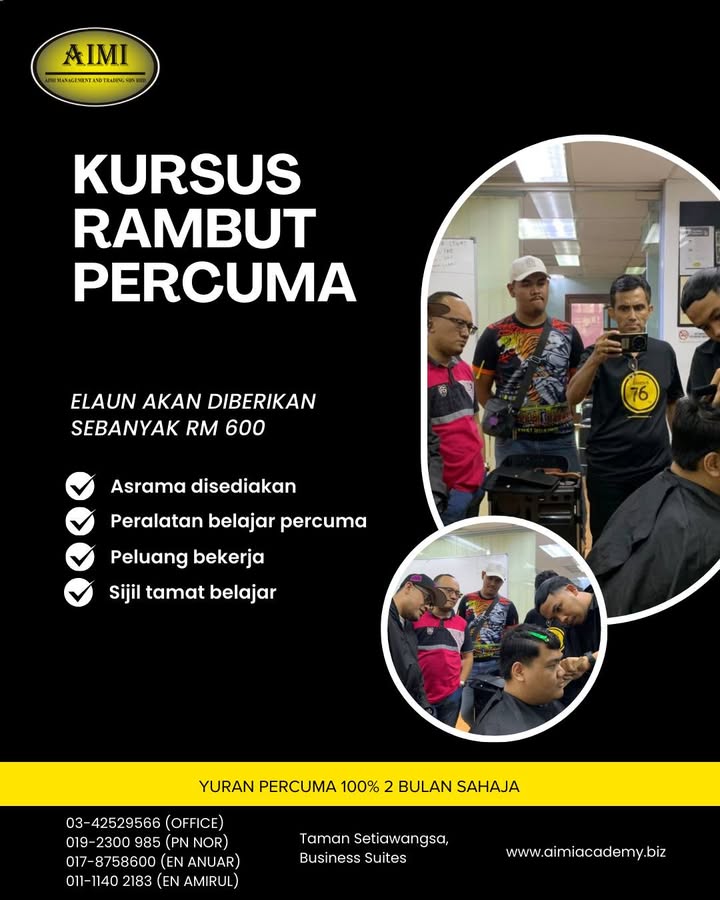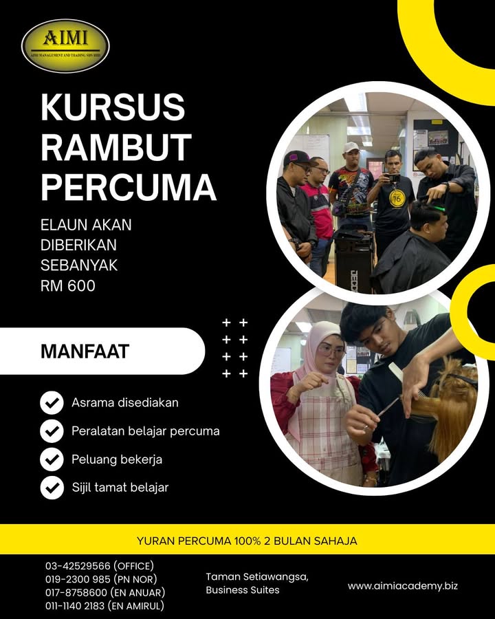 ✨ BINA KEMAHIRAN, CIPTA MASA DEPAN 2026! ✨ KURSUS DANDANAN RAMBUT PERCUMA (INTAKE 2026) Mulakan langkah ke dunia profesional dengan latihan kemahiran yang praktikal dan berfokus industri.