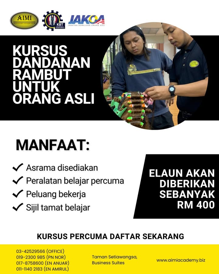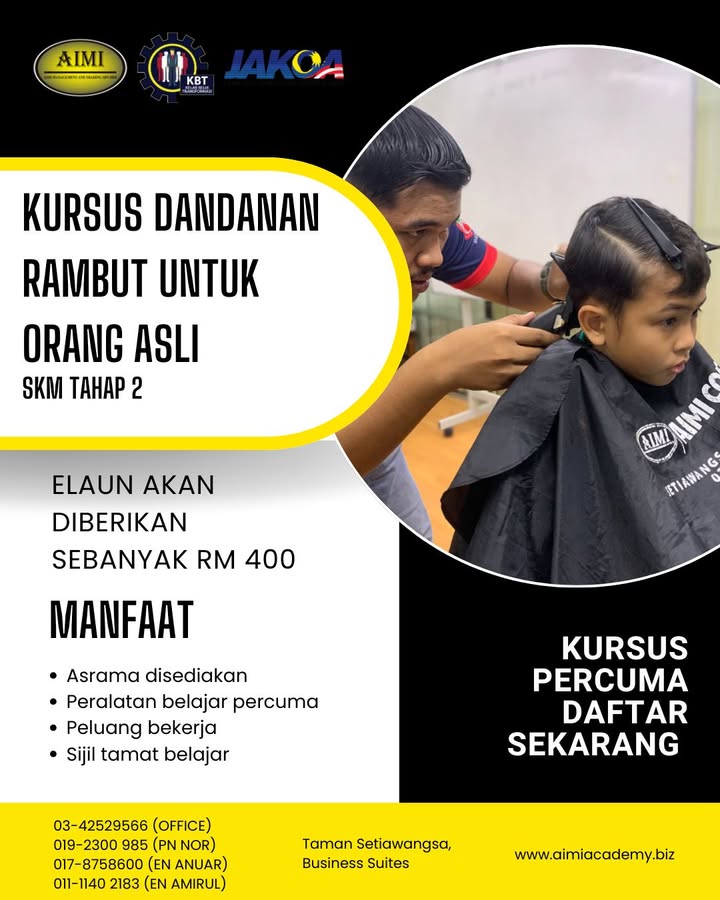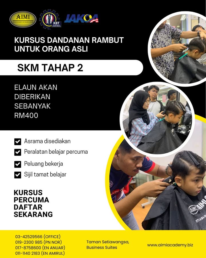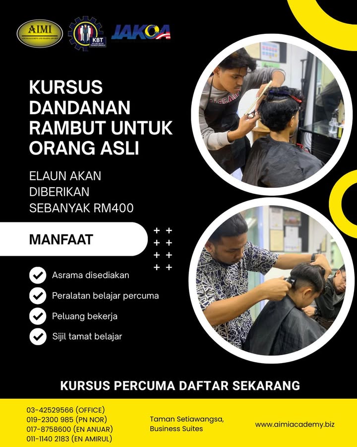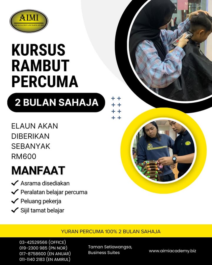 ✨ PELUANG KEEMASAN UNTUK BANGUNKAN DIRI! ✨ KURSUS GUNTING & DANDANAN RAMBUT PERCUMA – INTAKE 2026 Bukan sekadar belajar, tapi latihan sebenar untuk masa depan