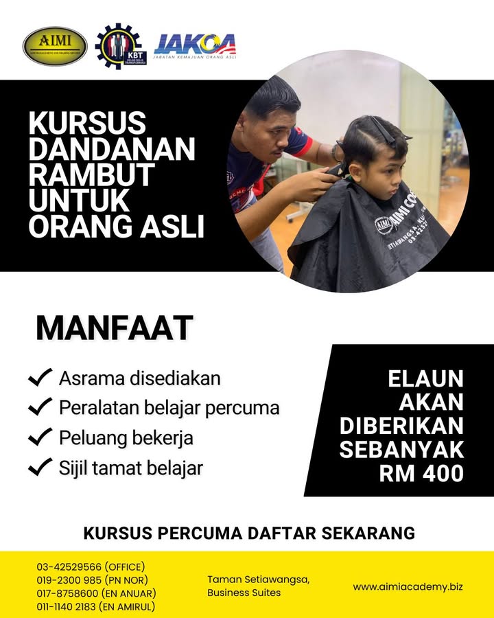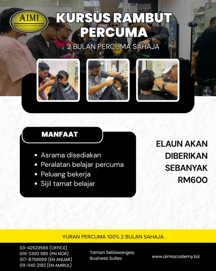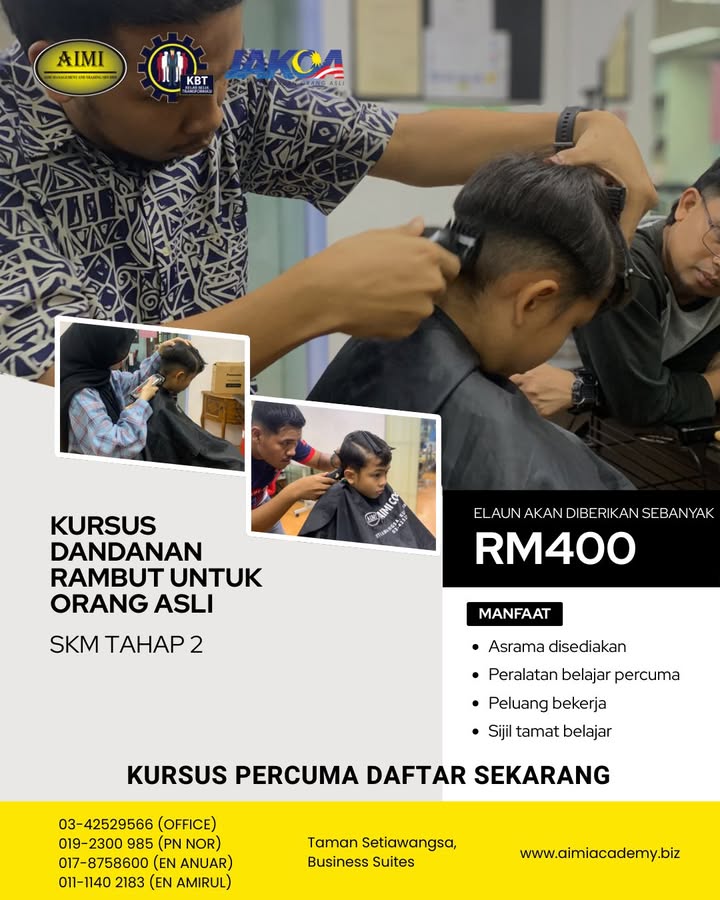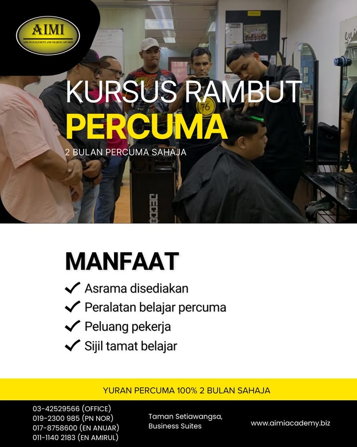 ✨ LANGKAH PERTAMA KE KERJAYA ANDA BERMULA DI SINI! ✨ KURSUS DANDANAN & GUNTING RAMBUT PERCUMA – INTAKE 2026 Berminat dalam dunia barbering & hairstyling? Kami bantu anda bina kemahiran sebenar hing...