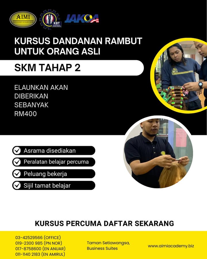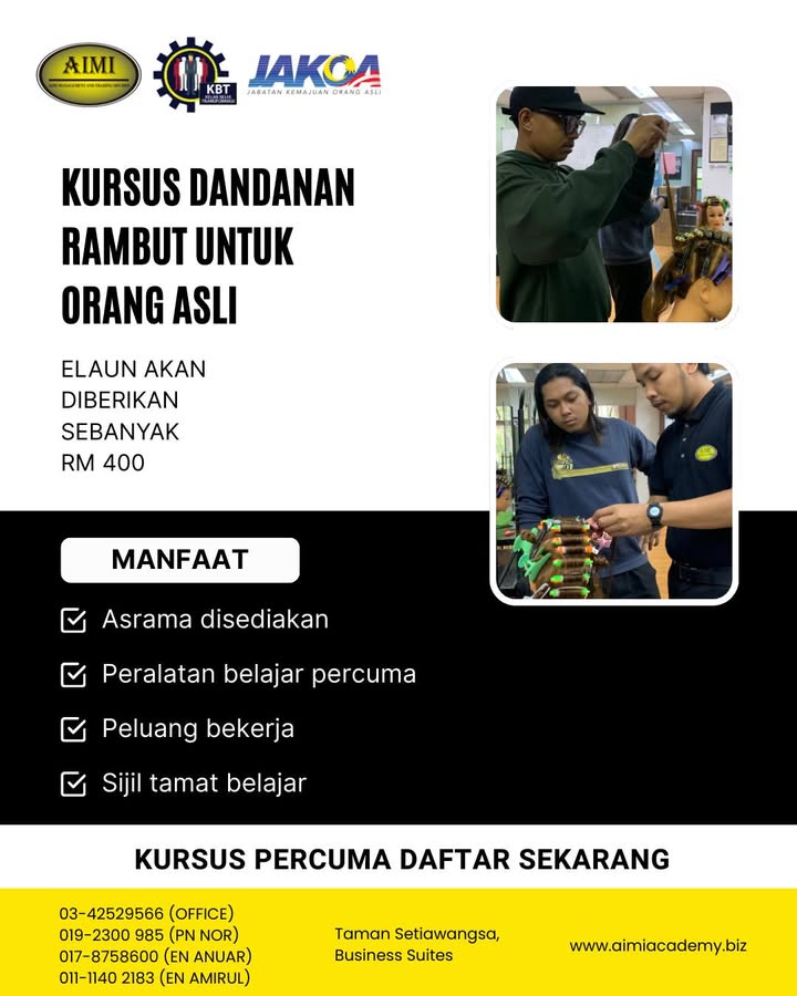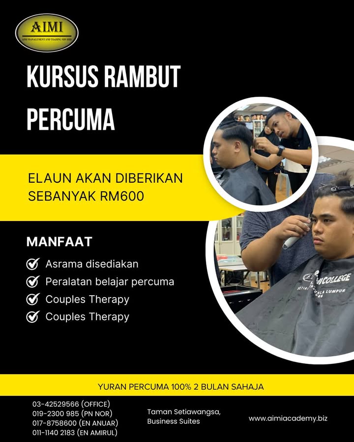 ✨ BINA MASA DEPAN DENGAN KEMAHIRAN TANGAN! ✨ KURSUS GUNTING & DANDANAN RAMBUT PERCUMA – INTAKE 2026 Tak perlu modal, tak perlu pengalaman. Kami sediakan latihan sehingga anda boleh bekerja atau buk...