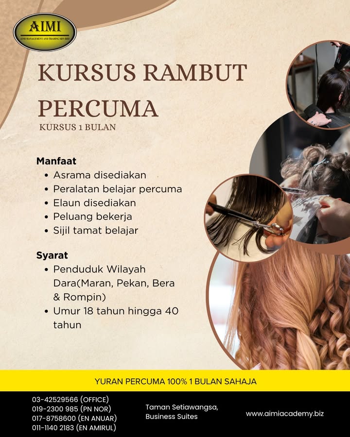 ⏳ TINGGAL BEBERAPA TEMPAT SAHAJA! KURSUS GUNTING & DANDANAN RAMBUT PERCUMA – INTAKE 2026 di Aimi Academy Pendaftaran hampir penuh. Jangan tunggu sampai terlepas peluang