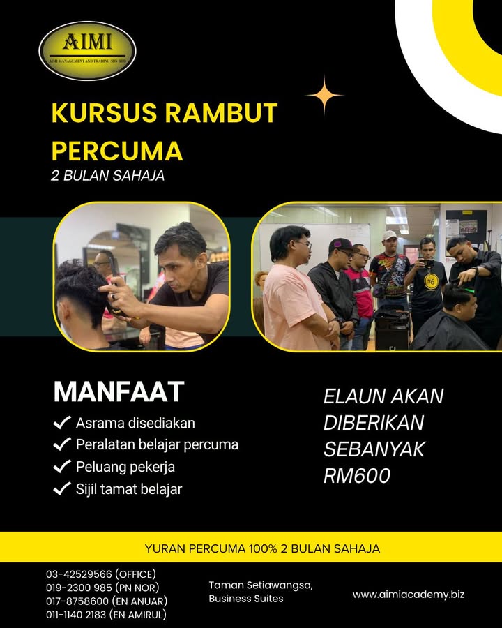 ⏰ MASA SEMAKIN SUNTUK! INTAKE 2026 HAMPIR DITUTUP KURSUS GUNTING & DANDANAN RAMBUT PERCUMA di Aimi Academy Hari ni daftar, masih ada peluang. Esok? Belum tentu.