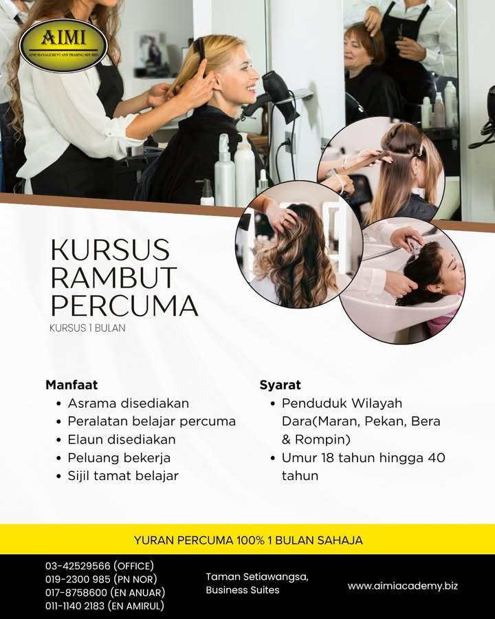 ✨ KURSUS RAMBUT PERCUMA ✨ ⏰ Tempoh: 1 Bulan ❌ Tanpa bayaran ❌ Tanpa pengalaman ✅ Latihan praktikal sepenuhnya Program ini direka untuk membantu anda menguasai kemahiran asas dan teknik moden dalam ...