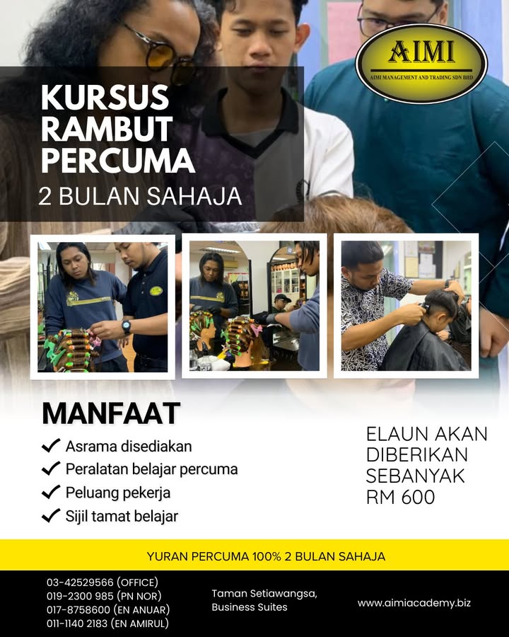 ❌ Tiada yuran ❌ Tidak perlu pengalaman ✅ Belajar kemahiran dandanan rambut secara praktikal ✨ KURSUS RAMBUT PERCUMA – 1 BULAN ✨ Sertai program ini untuk kuasai kemahiran asas & moden dalam dandanan...