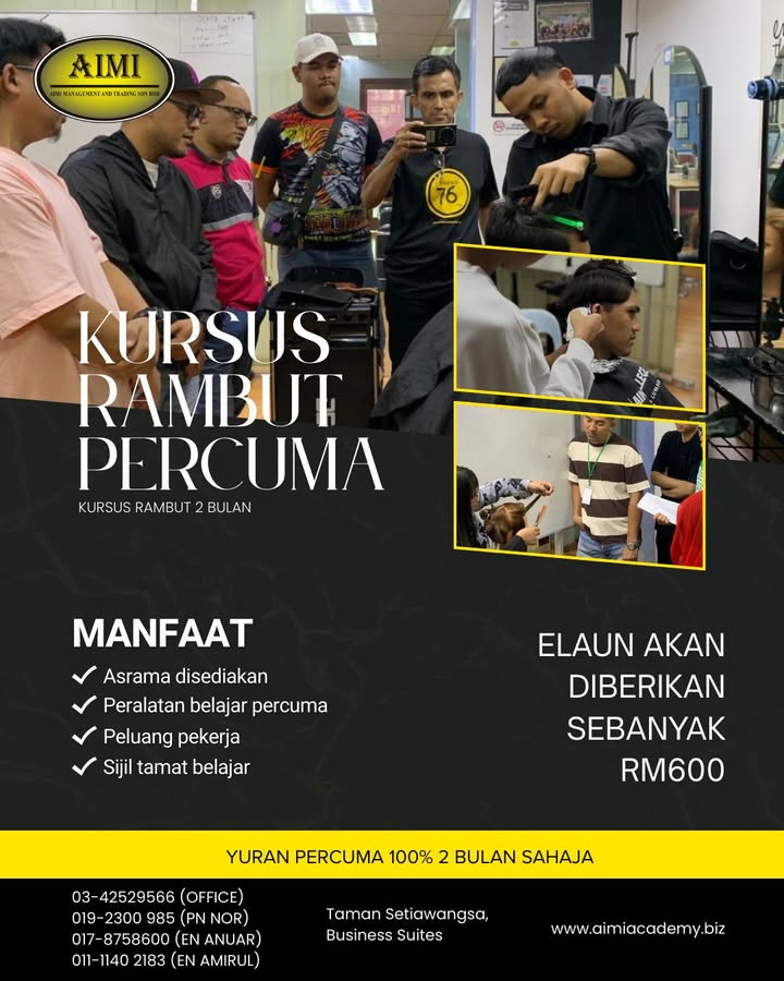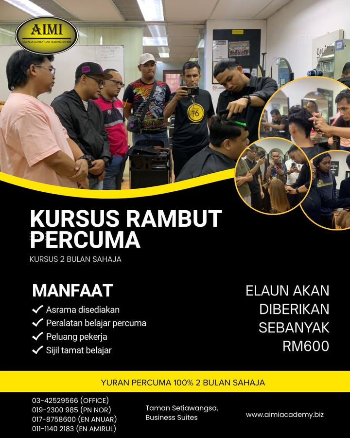 ❌ PERCUMA (tiada yuran) ❌ Tak perlu pengalaman ✅ Latihan dandanan rambut secara praktikal ✨ KURSUS RAMBUT PERCUMA – 1 BULAN ✨ Program khas untuk individu yang ingin mempelajari kemahiran asas dan m...