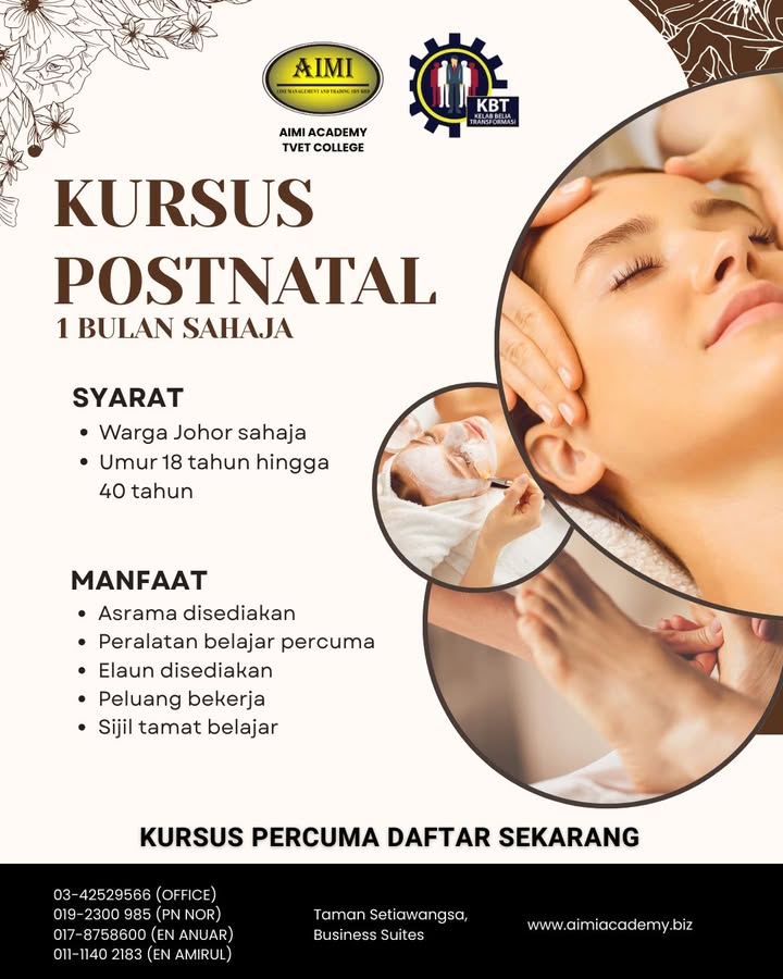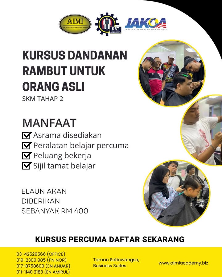 ❌ Tiada bayaran dikenakan ❌ Tidak memerlukan pengalaman terdahulu ✅ Latihan dandanan rambut secara praktikal ✨ PROGRAM KURSUS RAMBUT PERCUMA ✨ ⏰ Tempoh: 1 Bulan Program ini diwujudkan bagi memberi ...